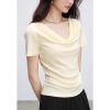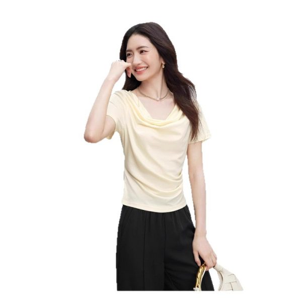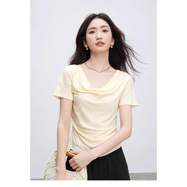 Cowl Neck Solid Color Short Sleeve T-Shirt Casual Commute Top Minimalist Design Base Shirt – Summer